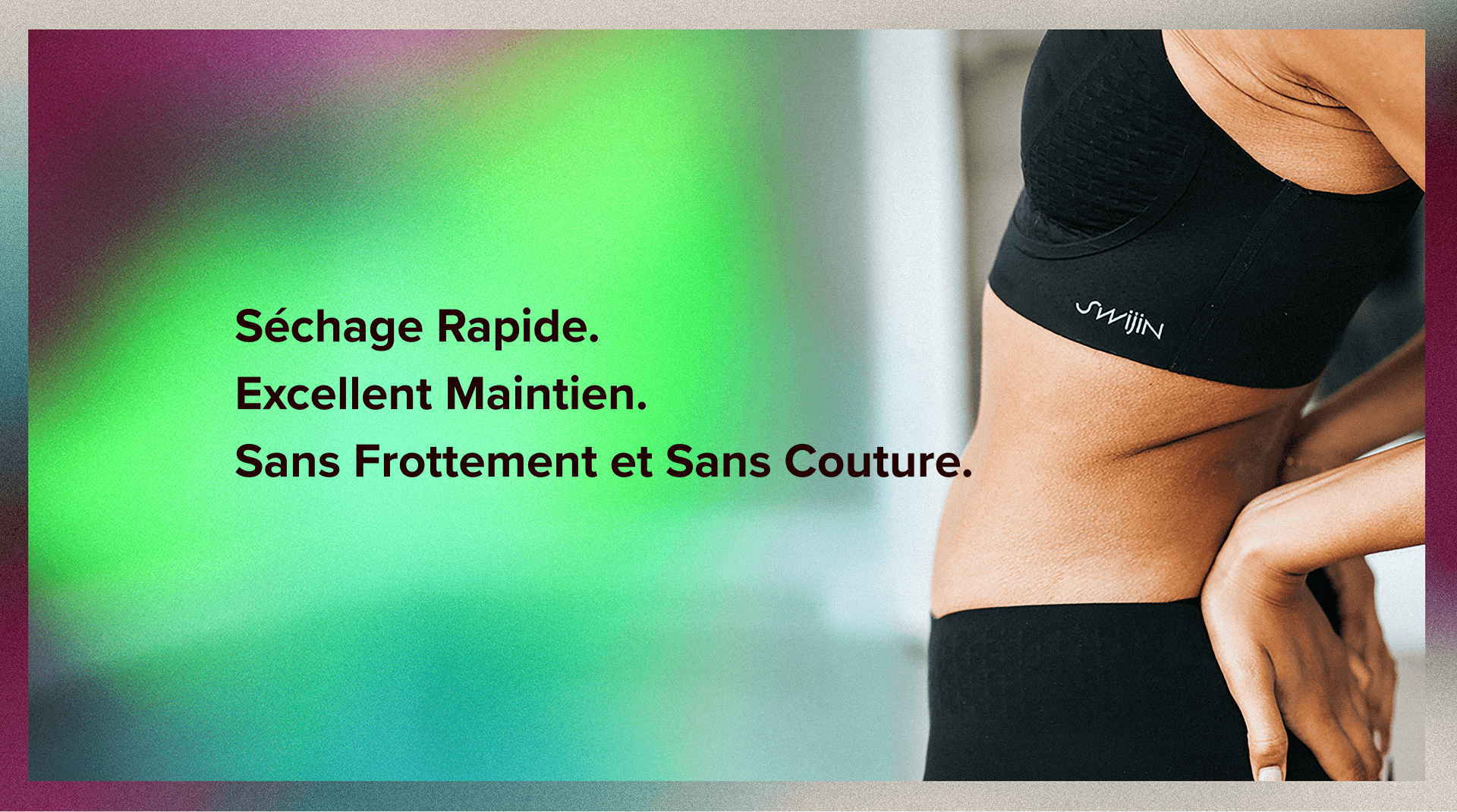 "A well-designed sports bra can boost female athletic performance by up to seven percent – and that's exactly what Swijin is built to do." "Une bonne brassière de sport peut améliorer les performances sportives des femmes de 7 %. C'est exactement la mission de Swijin." "Ein guter Sport-BH kann die Leistung von Sportlerinnen um sieben Prozent steigern – und genau das ist das Ziel von Swijin."